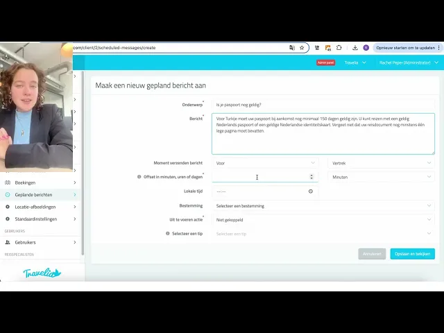 Het is mogelijk om geautomatiseerde berichten te sturen naar je klant. Bijvoorbeeld over de geldigheid van reisdocumenten of benodigde vaccinaties. In de video zie je hoe je een pushbericht kan aanmaken en instellen.